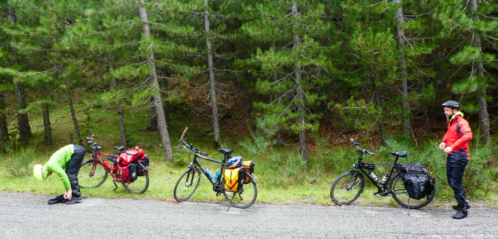 ![]() Nach 52 km erreichen wir den höchsten Punkt der heutigen Etappe und rollen bergab zum heutigen Zielort. In Summe waren es nur 59 km, aber 1900 Höhenmeter. Die Tatsache, dass wir alles Proviant von Startpunkt mitnehmen mussten (es gibt auf der gesamten Etappe keine Verprlegungsmöglichkeit), hat es nicht einfacher gemacht. |