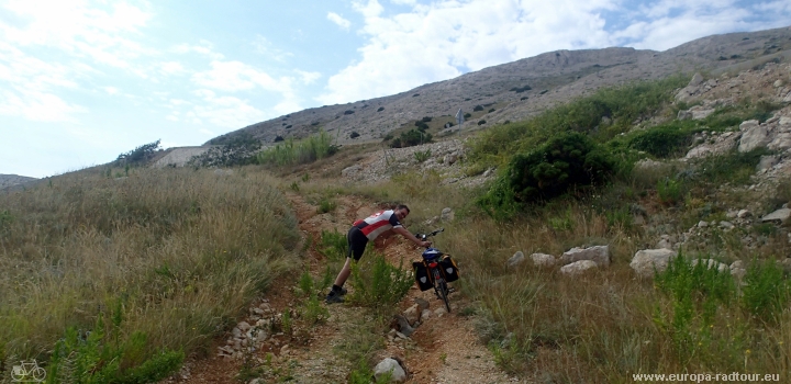 ![]() Kurz bevor wir die Stadt Pag erreichen, nehmen wir eine der selten blöden Abkürzungen, die bei der Planung schon mal passieren. Die Abkürzung ist anstrengender und steiler, aber dafür auch länger. Einfacher wäre es, nach Pag hinein zufahren und dann im spitzen Winkel auf die 106 zu treffen. Aber wie man sieht, kann man diesen spitzen Winkel auch abkürzen. |