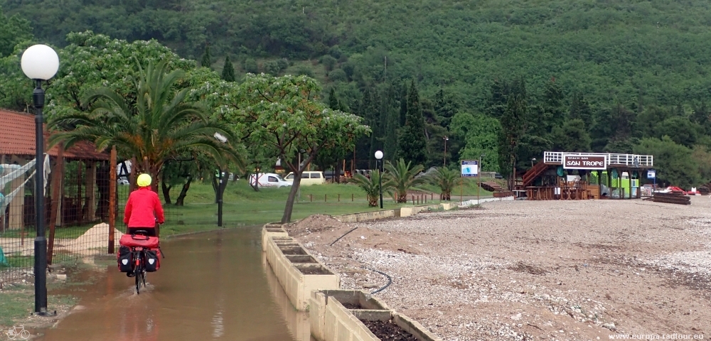 ![]() Bei Wikipedia ist zu lesen, dass die Stadt Budva ursprünglich auf einer Insel lag und mittlerweile durch eine Sandbank mit dem Festland verbunden ist. Bei starkem Regen scheint diese Entwicklung rückläufig zu sein: trockenen Fußes kommt man da nicht wieder weg. |